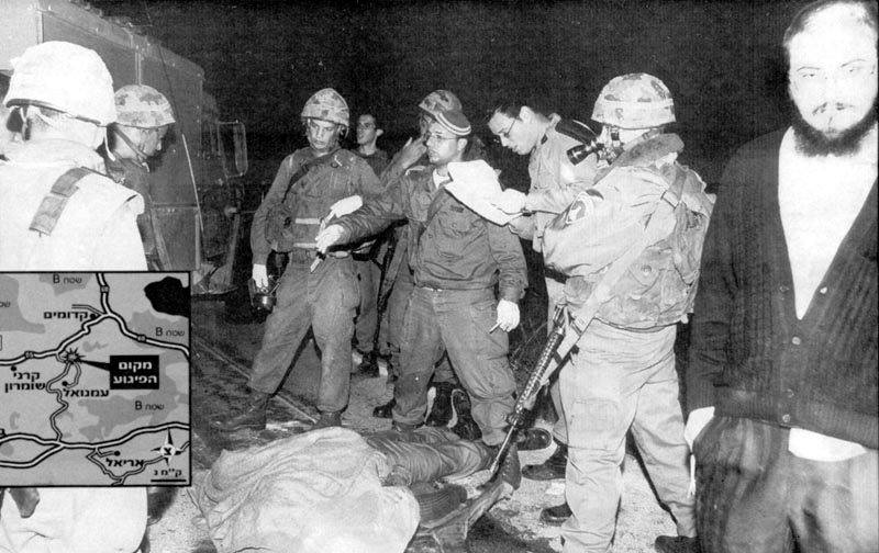 שוטר בוחן את הפגיעות הקטלניות על דופן האוטובוס